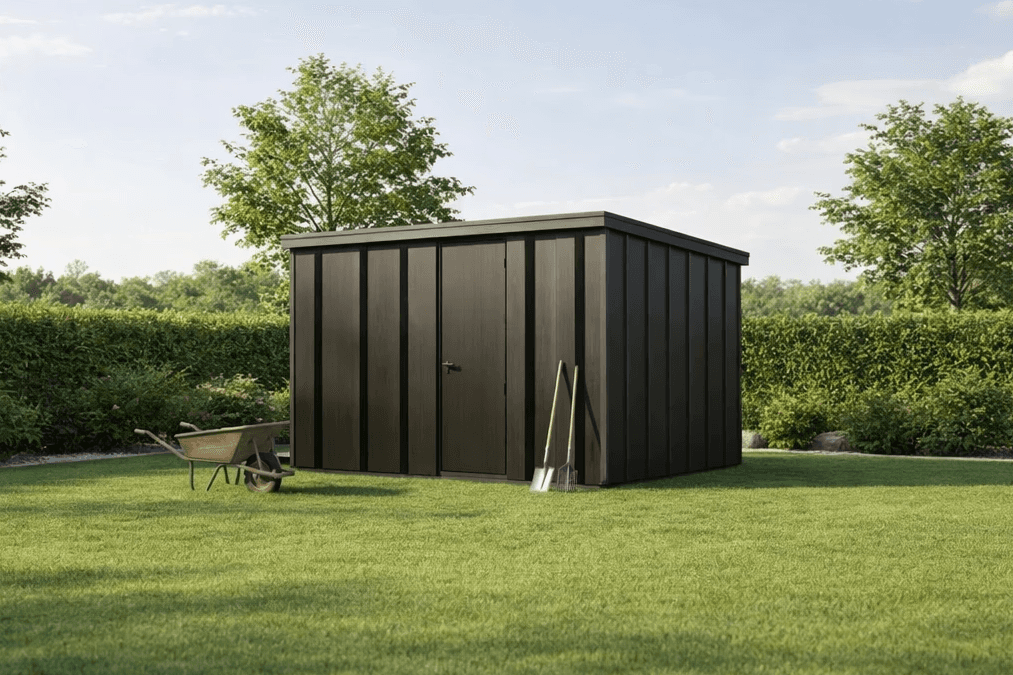 Elegancki domek narzędziowy łączy funkcjonalność z estetycznym, nowoczesnym wyglądem, który doskonale komponuje się z przestrzenią ogrodu.